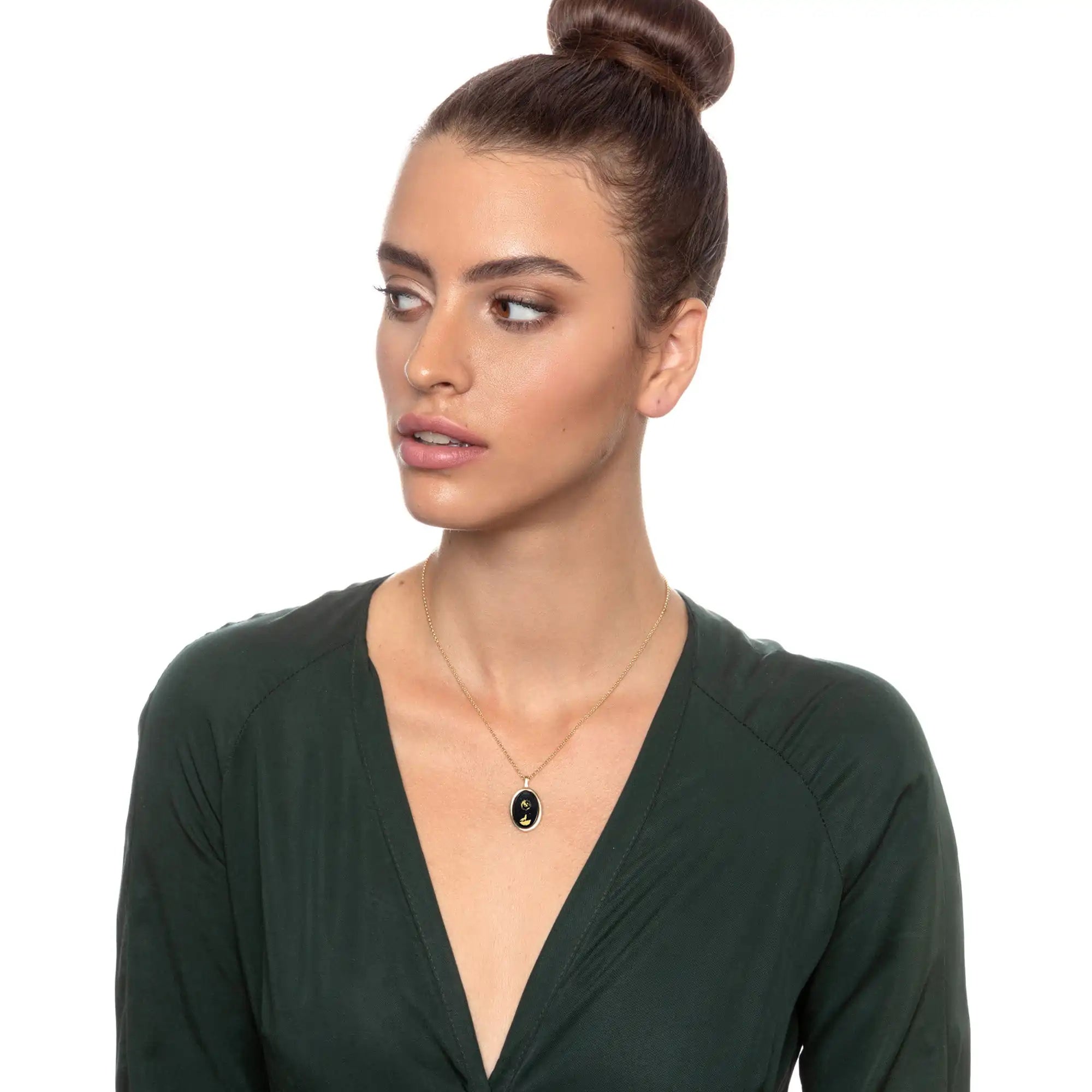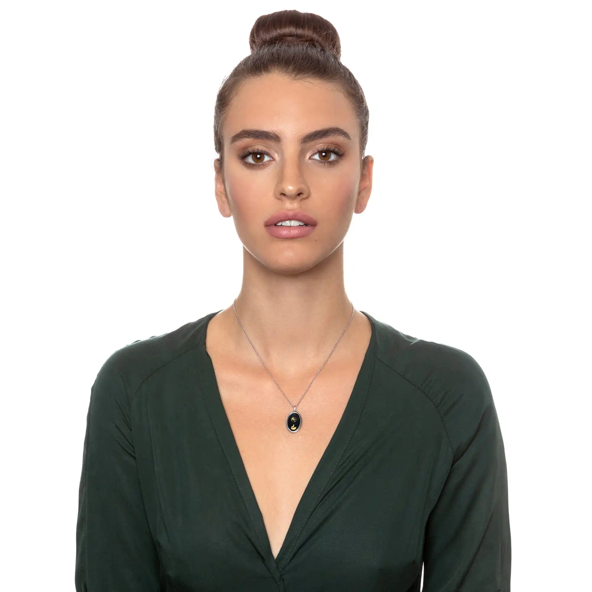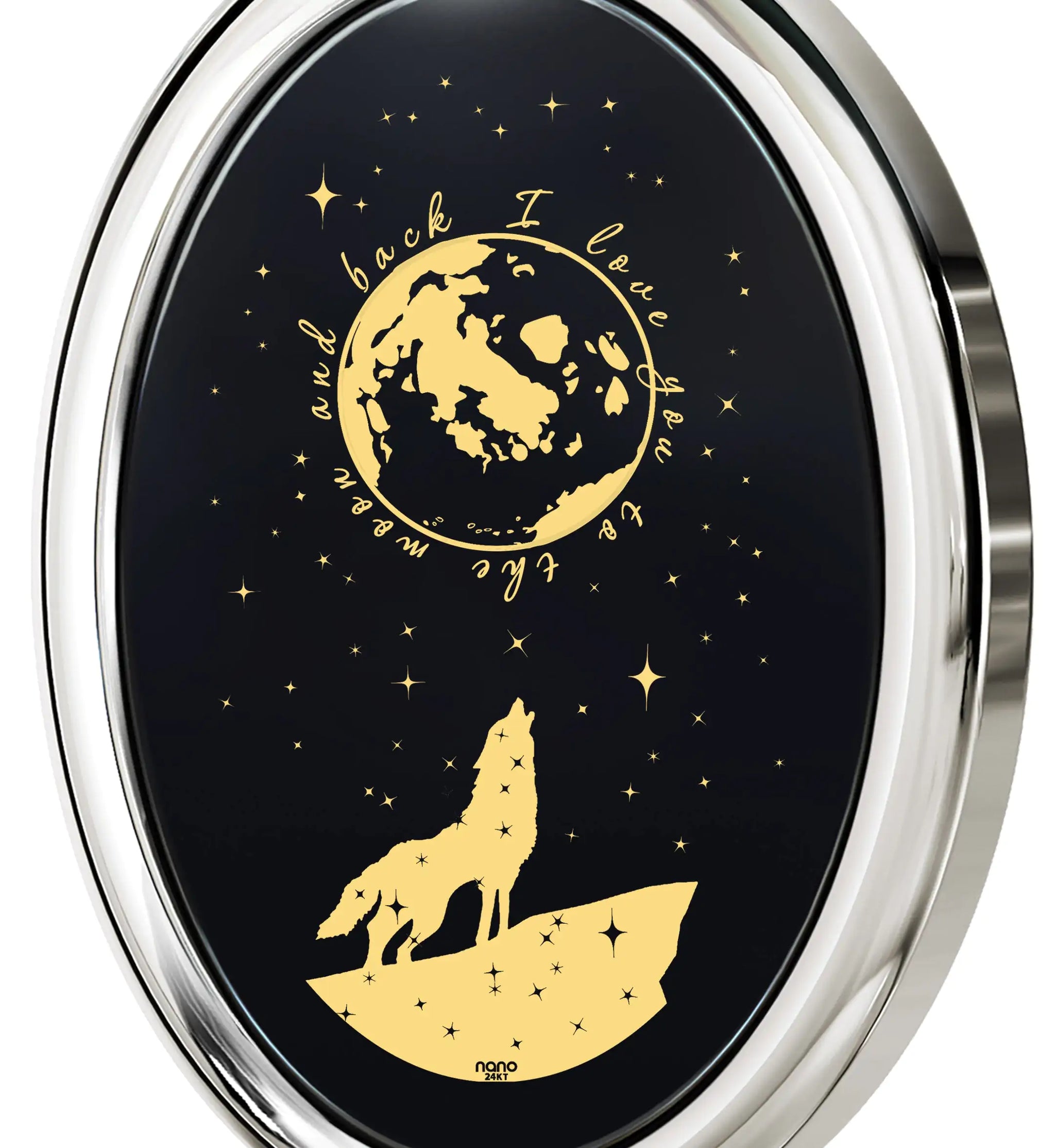 An elegant onyx pendant inscribed with "I love you to the moon and back" magically outlining an enchanting full moon over a howling wolf in 24k gold detail and set your choice of oval metal frame.