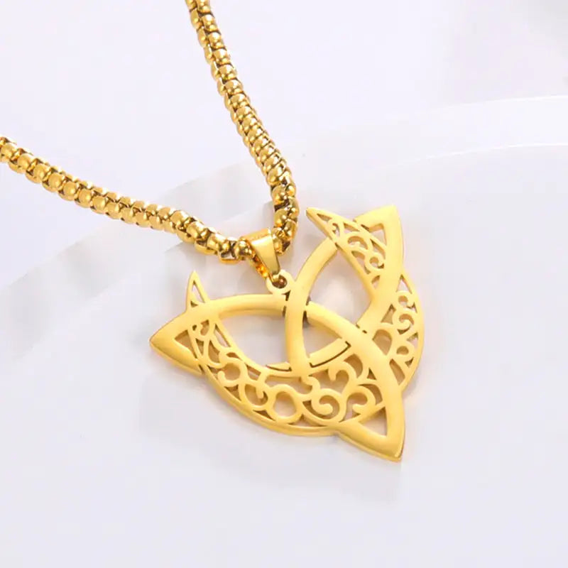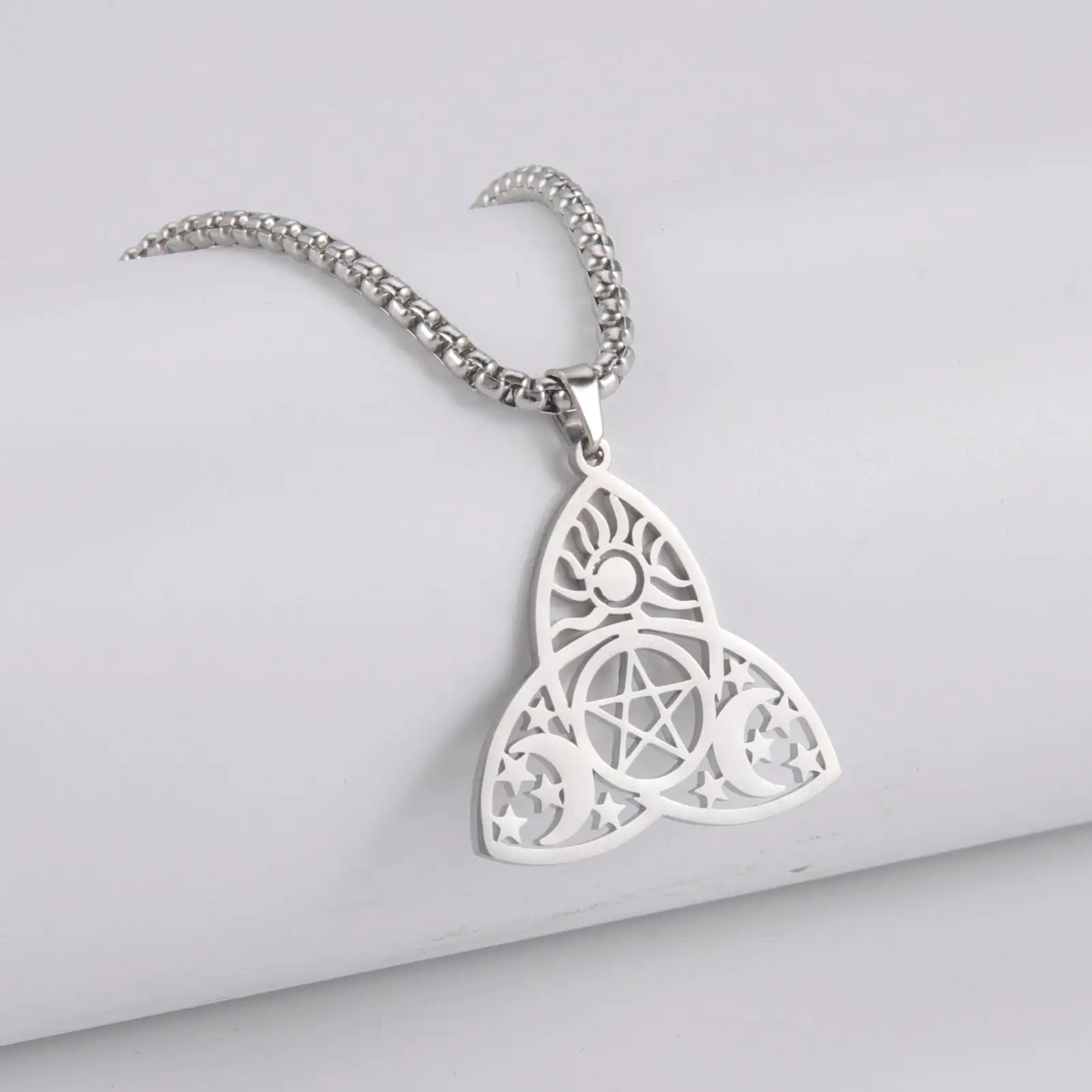 The Triquetra Moon Pentagram Necklace is the perfect addition to any outfit. Crafted from stainless steel with a 60cm chain, this necklace makes for a timeless piece that captures the beauty of the classic pentagram design. The pendant is 29.7 x 29.9 mm in size and takes on a look unlike any other jewelry piece, making it both unique and modern while still being stylish and sophisticated. Plus, its intricate design features have a spiritual background and make it special for any lover of symbolism and mythology alike. The ideal accessory for casual wear or formal occasions, the Triquetra Moon Pentagram Necklace is sure to wow everyone who sees it!